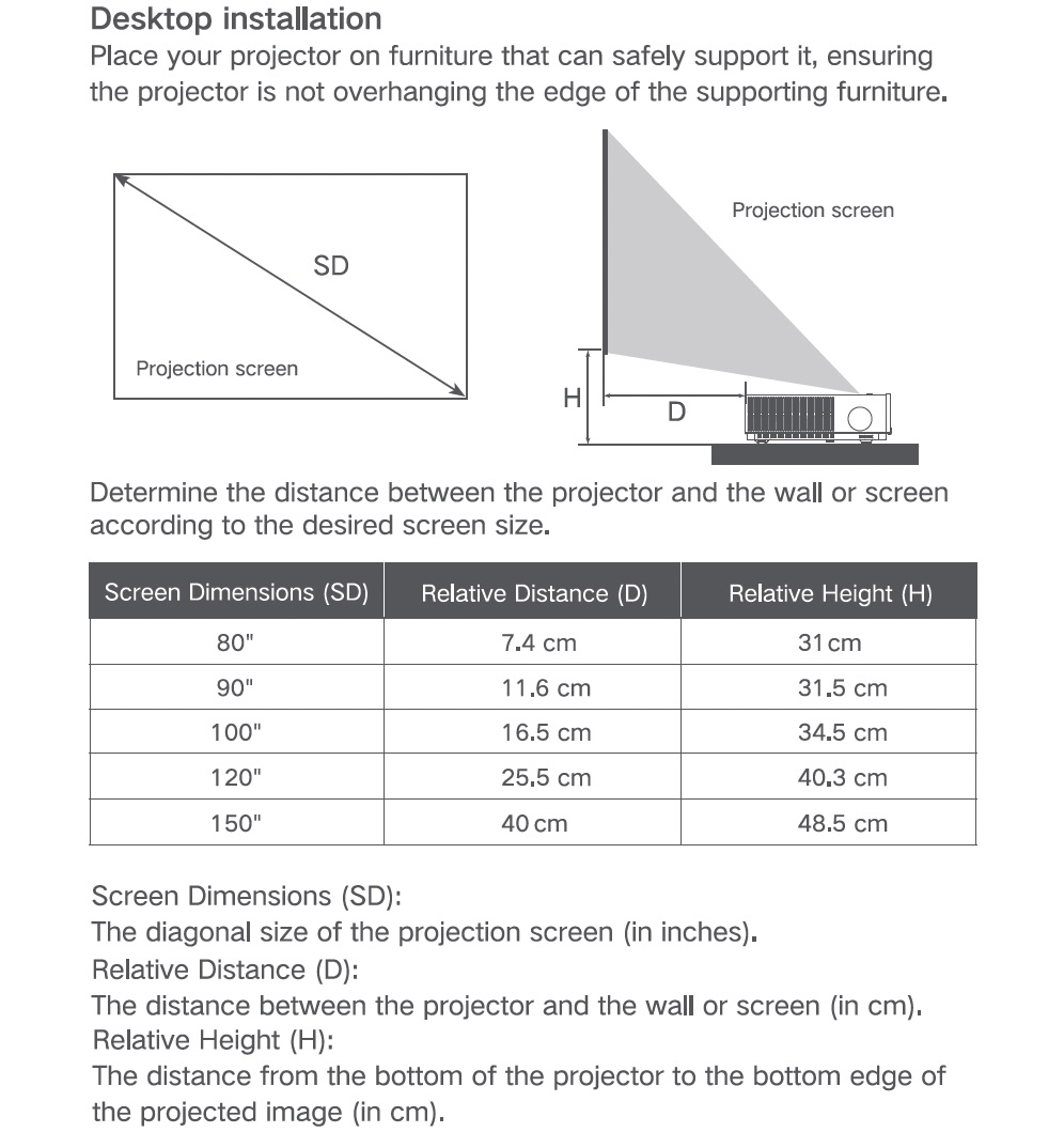 Screen size | 1,80 m ~ 3,30 m (80″ ~ 150″) diagonaal |