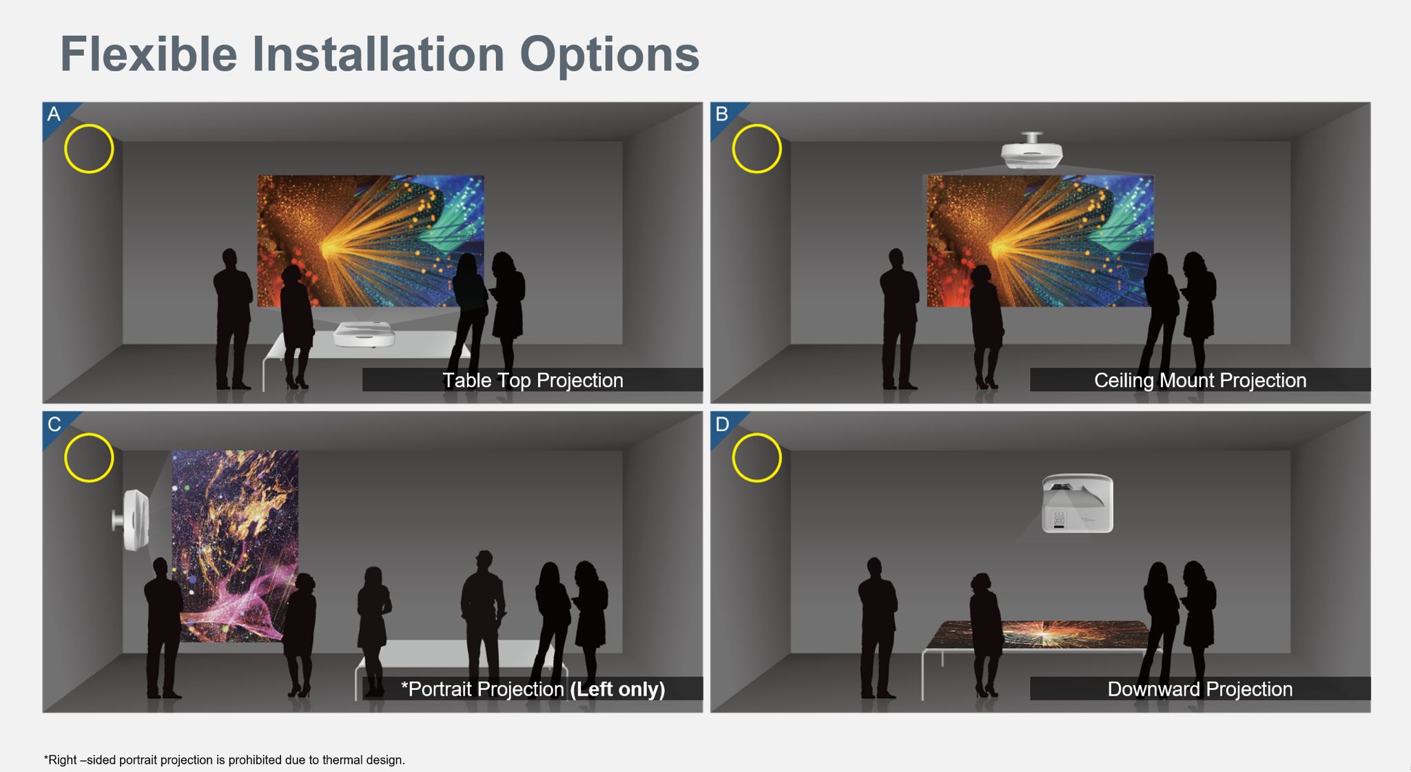 Met 360°-projectie* kunnen beelden in elke richting worden weergegeven, waardoor u de vrijheid en veelzijdigheid heeft om deze projector op de gewenste locatie te installeren.